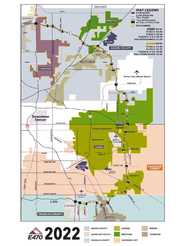 The Northwest Parkway and E-470 are two entirely separate toll roads, joined together at I-25, north of Denver. Both Northwest Parkway and E-470 use the ExpressToll® prepaid pass system. The same ExpressToll® tags may be used on Northwest Parkway and on E-470, as well as all HOV Lanes in Colorado. If, however, you do not have an ExpressToll® account and you receive a GO-PASS™ bill from Northwest Parkway and a License Plate Toll bill from E470 for your tolls, you must pay each of these bills separately. E-470 is the toll road that circles the eastern metro Denver area and extends from I-25 in the south at approximately Lincoln Avenue to I-25 in the north between 144th Avenue and State Highway 7. Northwest Parkway extends from E-470 at I-25 in the north to Highway 36 (the Boulder Turnpike).